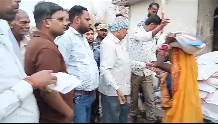 : अग्नि से पीड़ित परिवार बीच जाकर किया राशन का वितरण।
